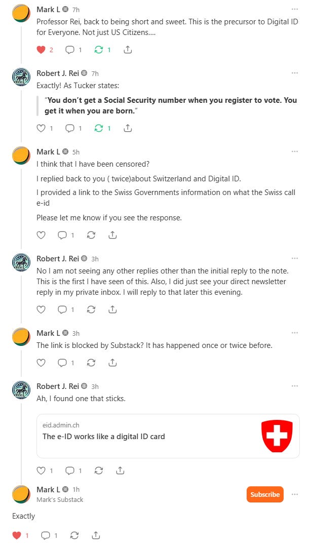 A small but revealing event occurred recently inside a Substack note thread.1 A reader attempted to reply with a link to official Swiss government documentation explaining that country’s electronic identity law. The reply posted successfully—but the link itself vanished within seconds, leaving the explanatory text intact and the reference gone. No warning. No notice. No explanation.