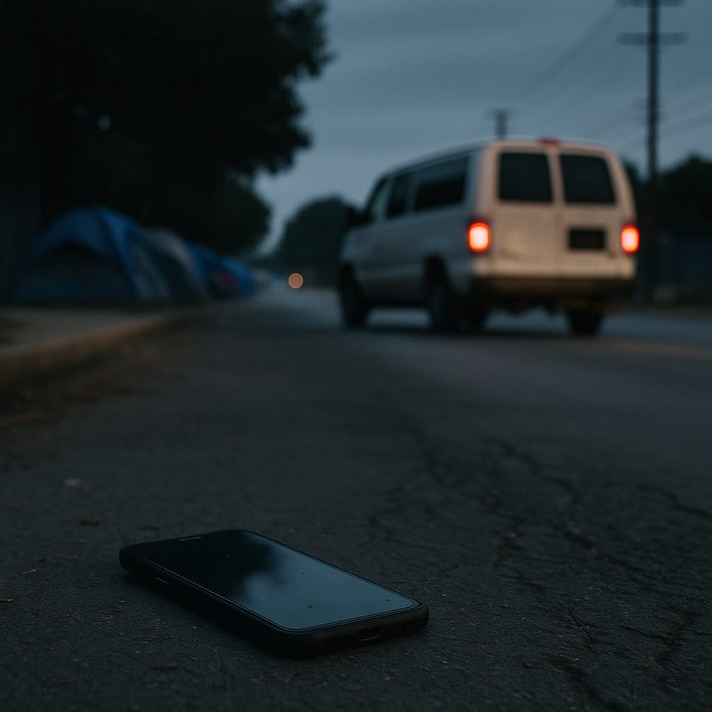 A van idling at the edge of an encampment is the physical expression of an unseen equation that began days earlier in a data center.